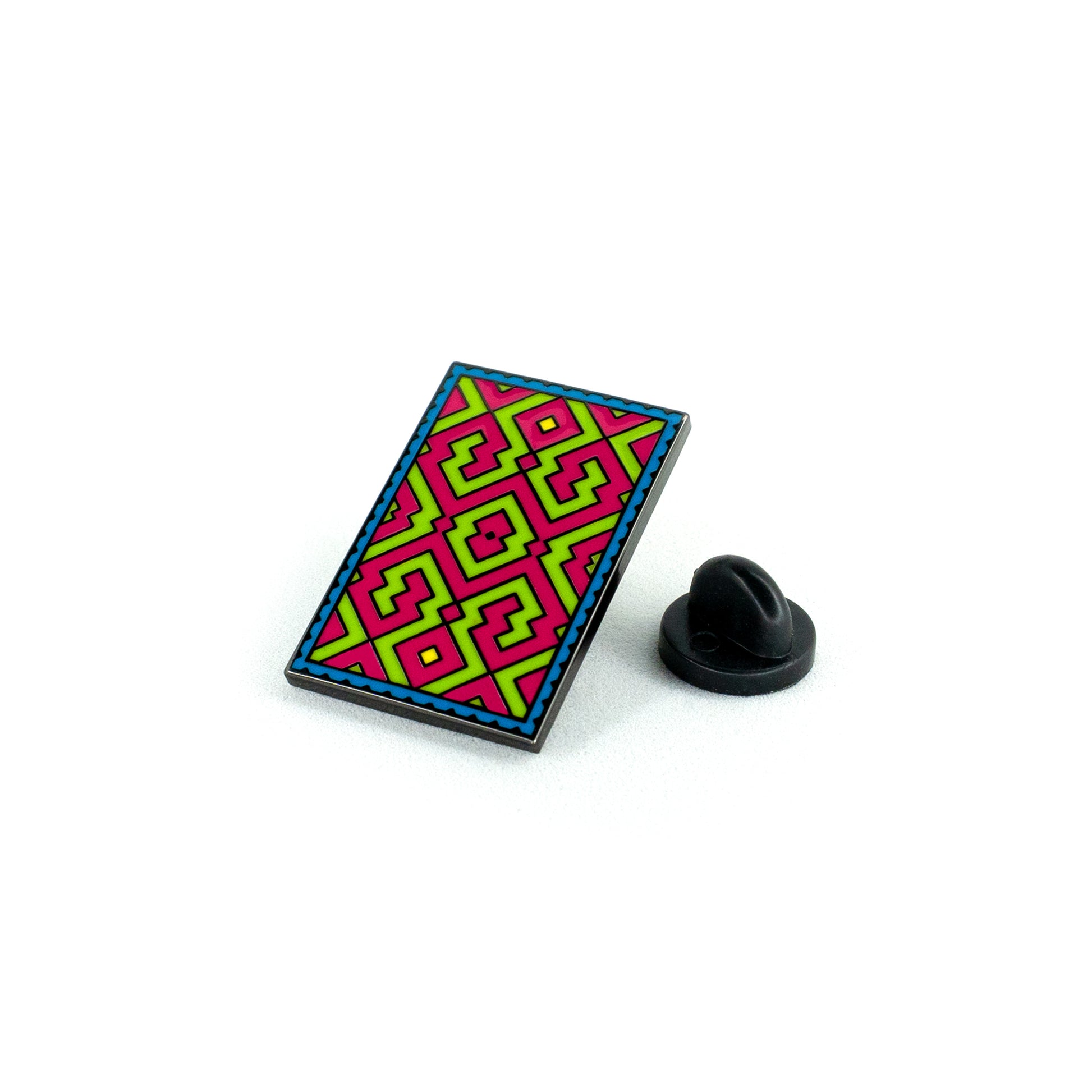 Pin metálico con acabado niquelado negro y esmalte duro con broche de goma negro.