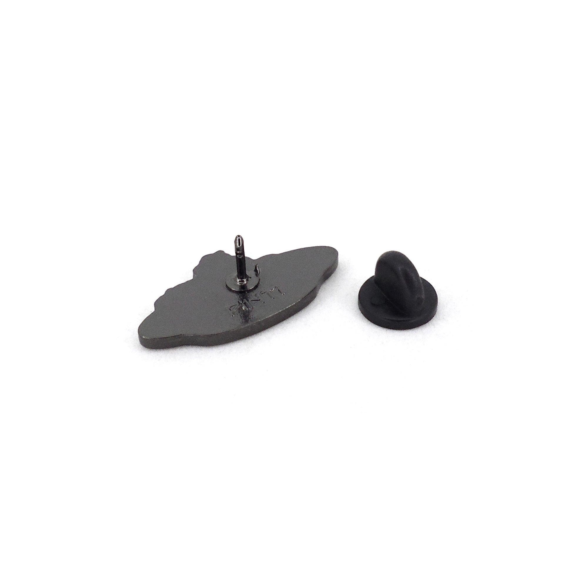 Pin metálico con acabado niquelado negro y esmalte duro con broche de goma negro.